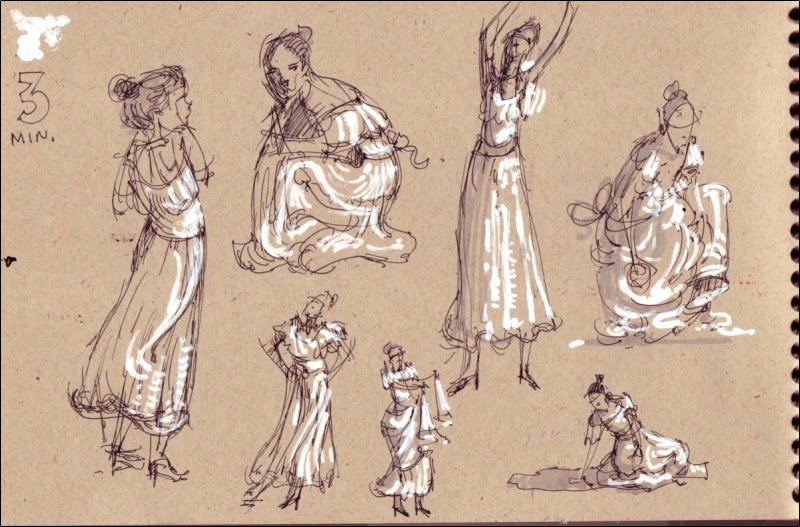 Here's some quick sketch work from my class demo's etc. Some are from location drawing and the others are from costume drawing for animation. Mostly 3-8 minutes a piece...